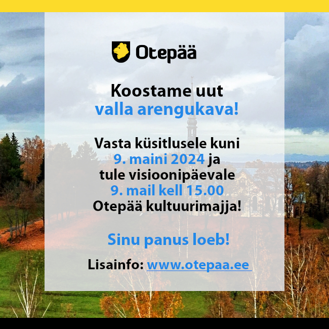 Otepää vald on alustanud Otepää valla uue arengukava koostamist ning Sul on võimalik edastada oma tagasiside ja ettepanekud küsitlusele vastates. Küsitluse tulemusena saame ülevaate elanike tänastest murekohtadest ja ideedest, kuhu poole võiks Otepää vald liikuda.