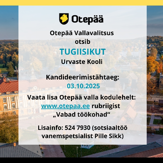 Avaldus ja CV saata hiljemalt 3. oktoobriks 2025 e-posti aadressile kristin.leht@otepaa.ee