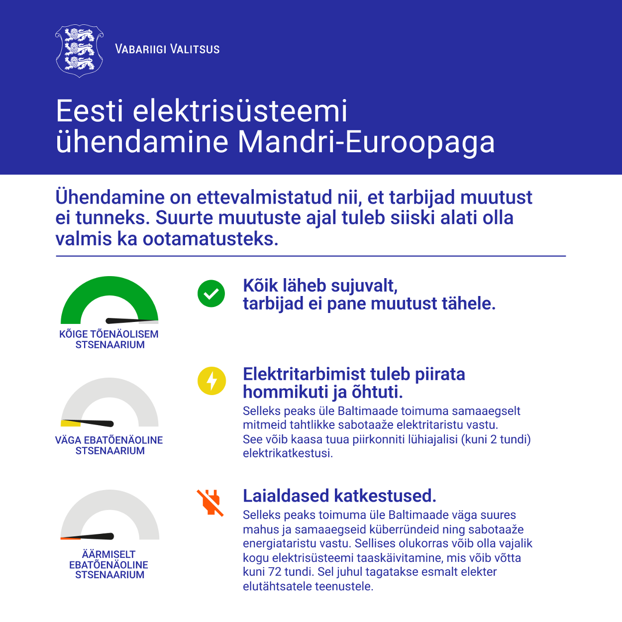 - Elektritarbimist tuleb piirata hommikuti ja õhtuti. Selleks peaks üle Baltimaade toimuma samaaegselt mitmeid tahtlikke sabotaaže elektritaristu vastu. See võib kaasa tuua piirkonniti lühiajalisi (kuni 2 tundi) elektrikatkestusi. Stsenaariumi realiseerumine on väga ebatõenäoline.