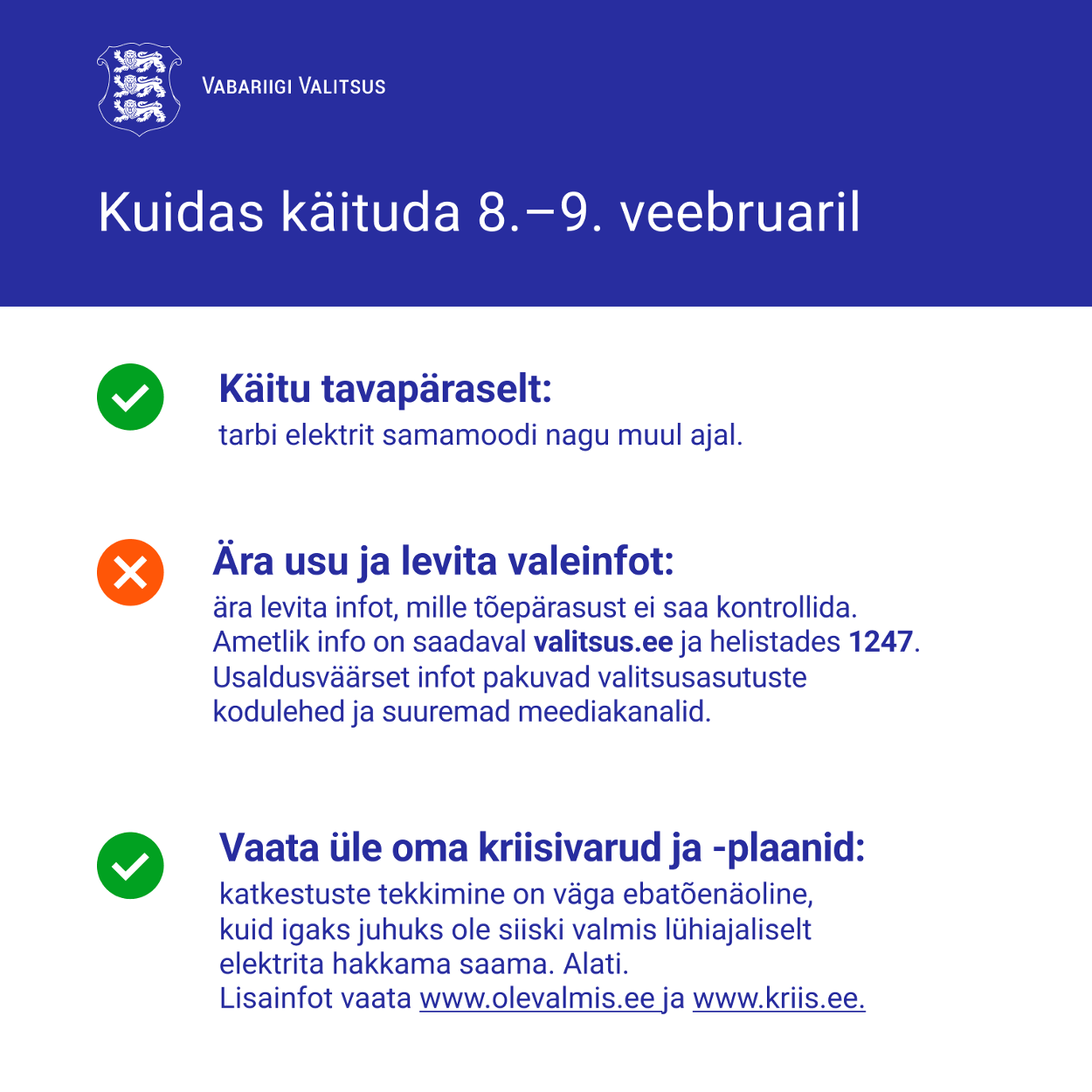 - Vaata üle oma kriisivarud ja -plaanid: katkestuste tekkimine on väga ebatõenäoline, kuid igaks juhuks ole siiski valmis lühiajaliselt elektrita hakkama saama. Alati. Lisainfot vaata www.olevalmis.ee ja www.kriis.ee .
