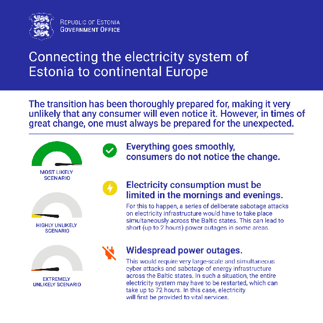 Estonia, together with Latvia and Lithuania, will fully decouple from the Russian electricity system and join the continental European frequency area. This step will strengthen Estonia's energy security by making the energy system independent from Russia.