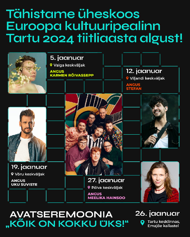 Tartus toimuvale ametlikule Euroopa kultuuripealinna avamisele eelnevad ja järgnevad avamised Lõuna-Eestis: Valgas (05.01), Viljandis (12.01), Võrus (19.01) ja Põlvas (27.01). Maakondlikel kultuuripealinna avamistel astub üles Lõuna-Eesti reggae-bänd Angus koos kultuuripealinna piirkondadest pärit artistidega: Stefan, Uku Suviste, Karmen Rõivassepp ja Meelika Hainsoo.
